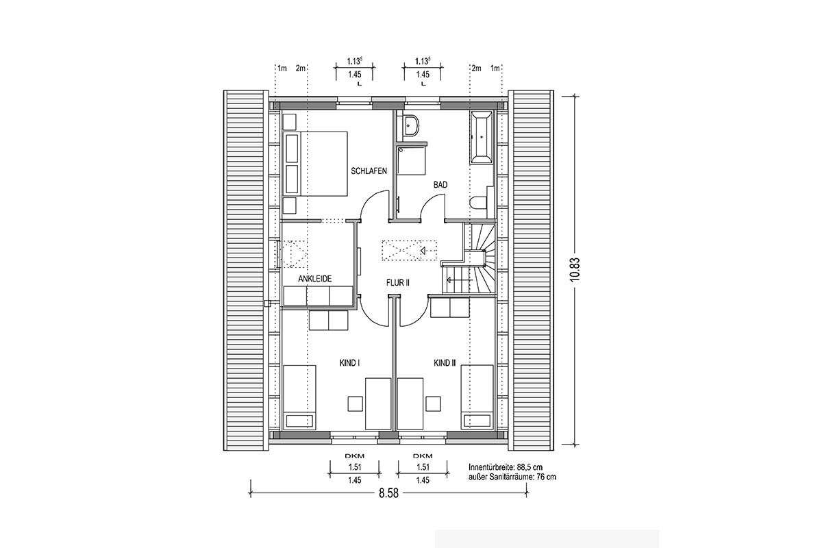 In das Obergeschoss kommen Sie über eine hochwertige Holztreppe. Die obere Etage verfügt über 3 sonnige Schlaf-/Kinderzimmer je ca. 12 m², 1 Ankleide ca. 4,5 m² sowie ein modernes Badezimmer.